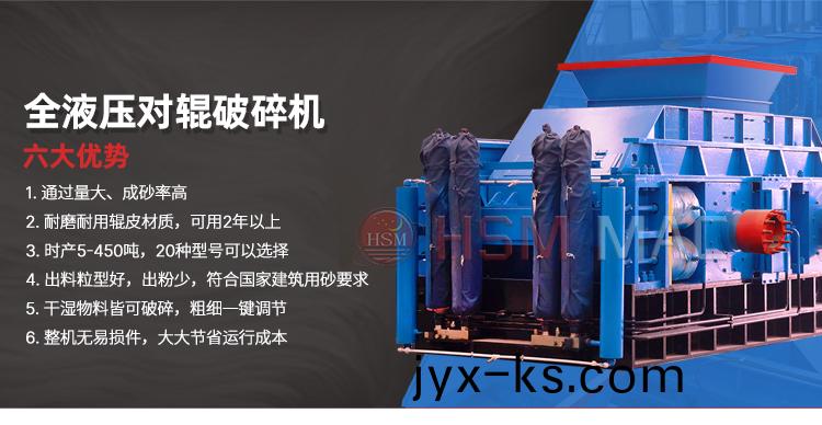 液压对辊破碎机通过辊轮进行破碎作业。物料由进料口进入辊子之间,通过挤压作用破碎河卵石,两辊轮之间有一定的间隙,两辊轮间隙变大,物料出料粒度变大,在压紧弹簧的作用下两辊轮间隙变小,出料粒度变小。通过改变调整间隙,可以控制物料的出料粒度。