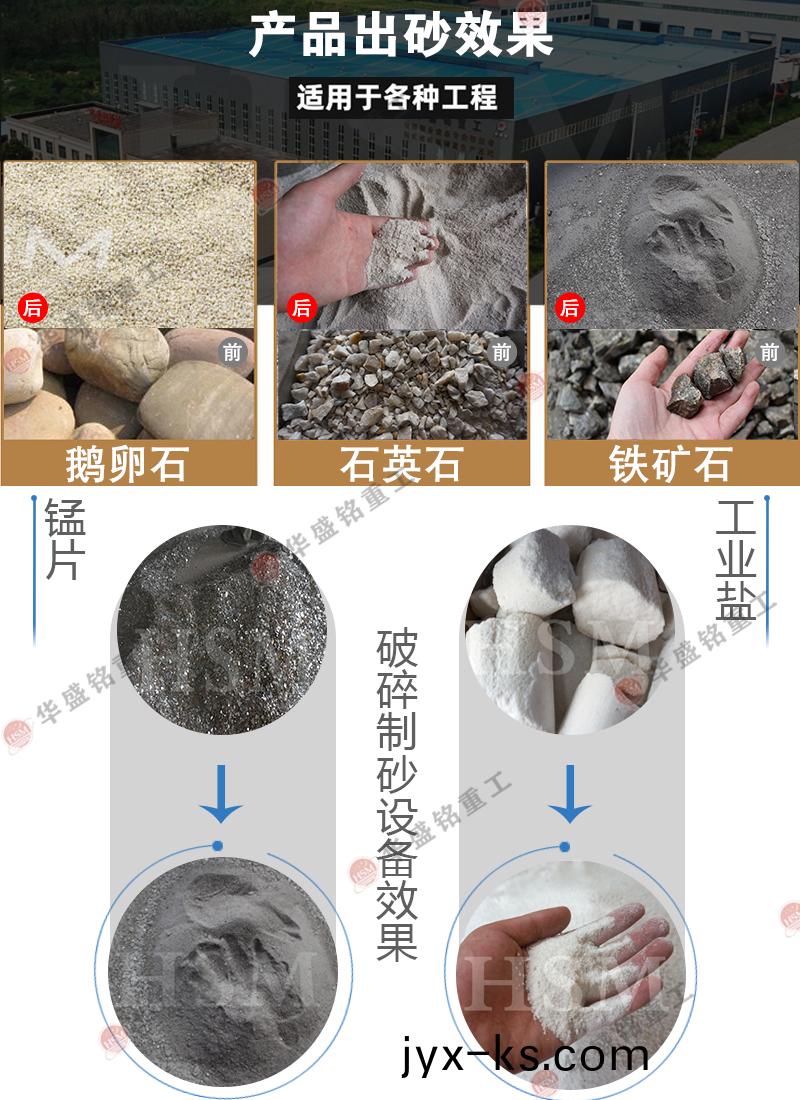河卵石、方解石、石英、玻璃、大理石、鹅卵石、膨润土、铁矿石、青石、山石、石灰石、风化砂、辉绿岩、花岗岩、玄武岩等物料的破碎制砂工作。